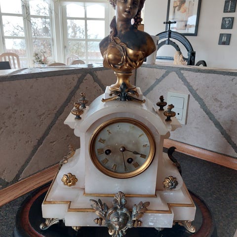 kaminur, grøn marmor fod, et flodt kaminur med en stående figur