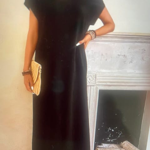 Lang t-shirtkjole / kjole med korte ærmer, striber i army grøn og creme hvid. Kjolen falder tungt, er strygefri og har en smule shine i materialet.