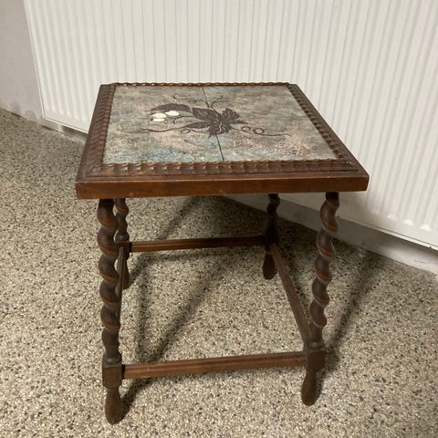 Intarsia-bord, nøddetræ, 100 år gl., Bord i nøddetræ med et meget smukt intarsia arbejde og caprifole-formede ben, l:37 h:42 b:27cm, Spiller en lille melodi når låget åbnes. Inspireret af rokokotiden. Høj håndværksmæssig kvalitet. Bud modtages. Priside