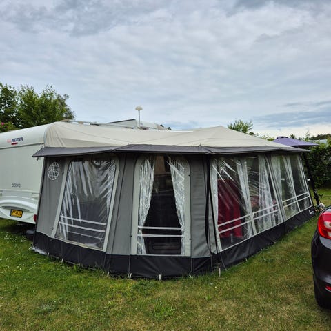 Stort og rummeligt Penta fortelt med godt lysindfald fra de store vinduer og lysstriberne i taget. Det er med indgangsportal. Stellet er kraftig og OK. Teltdugen har et par små reparationer på ikke så synlige steder. A- mål 1015 og bredde 3,5 meter. Vi har brugt det som fastliggere, men ønsker nu et mindre og lettere telt til at køre rundt med. Jeg har lige nedsat prisen til en efterårspris. :) Hvis I er mere til et nyt telt, kan I evt. nøjes med at bruge stængerne og indgangsportalen.