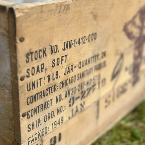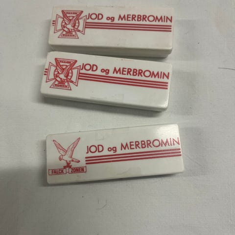Sælger her en apoteker-dåse af papir, metal og plast. Dåsen er fra apoteket på Københavns Militærhospital, der eksisterede fra 1928-1963.
