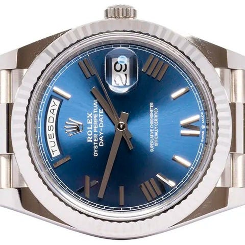 Rolex Day-date 36 mm 118239 med bokse og papirer fra 2004. Fuld 18 K hvidguld på President-lænke uden stræk. Flot stand uden nævneværdige brugsspor ud over de uundgåelige hairlines. Monteret med sølv factory diamant dial, som i denne udgave er 25.000 kr. dyrere end den almindelige skive. Smukt underspillet luksus-ur, som flyver lidt under radaren pga. de diskrete look. Aktuel listepris for 36 mm Day-Date i hvid-guld med diamant skive er 361.800 DKK.