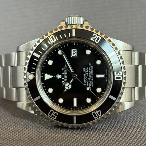 Rolex Sea-Dweller ref 16600 med bokse og papirer fra 2003. Fremstår i super flot stand med små brugsspor. Skarp symmetrisk kasse hvor bevels og de oprindelige skråpoleringer på hornene stadig er 100% intakte. Uret fremstår tæt på upoleret, hvor det kun lige er de værste hairlines på sider og lænke som er fjernet. Alt i alt et rigtig fint Sea-Dweller, som hører til blandt de velkendte 5-cifrede referencer, der samlermæssigt er stor efterspørgsel på for tiden, da disse ure er fra en tid, hvor funktionalitet og driftsikkerheden var Rolex kendetegn.