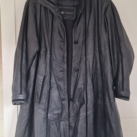Flot model, uld frakke med ægte læder, foret, 123 cm lang, i god stand.