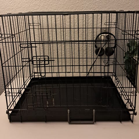 Hundebur til små hunde, måler ca. 104x52 i fuld opsætning. Kan foldes sammen og transporteres nemt. Fejler ikke noget :)