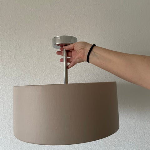 Lampen er udført i et kraftigt, beigefarvet stof på ydersiden, som giver et varmt og taktilt udtryk. Indersiden har en reflekterende sølvfinish med et diskret, stribet design, der skaber en flot dybde og sikrer en optimal spredning af lyset. Ophænget i sølv/krom metal og de tre diskrete wirer, der holder skærmen, fuldender det minimalistiske og elegante design.