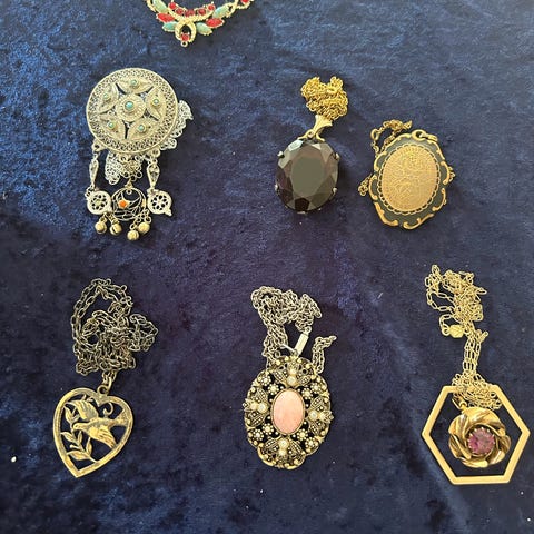 Vintage similihalskæder. Alle er i hel stand, medmindre andet er beskrevet, ingen af smykkerne er blevet pudset, alle er i metal, glas eller sten.