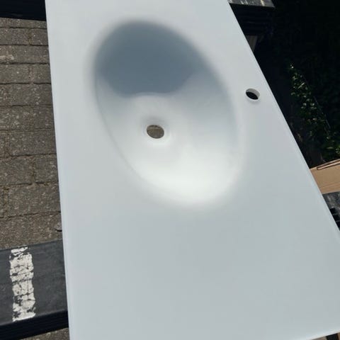 Glas vask, Væghængt vask, Væghængt badevask med tyk glasplade under vask samt stang med udtræk til håndklæde- se fotos af prøvesamling - vasken er ny og ubrugt 2 stk haves - den som foto og en meget ligende men med keramik vask istedet for materet glas