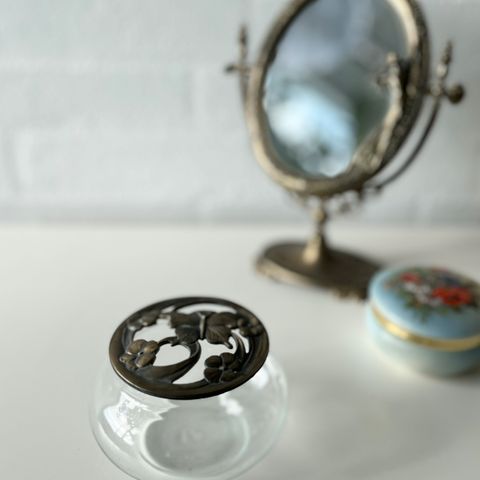 Antik potpourri skål, Vintage, Smuk stor antik potpourri skål med bund af tungt krystalglas og gennembrudt top af pletsølv.