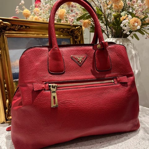 Prada taske i lys kalveskind med rynke effekt og guld skruer. Låsen skal repareres ellers fejler tasken intet, derfor den billige pris.
