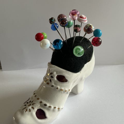 Gammel nålepude-sko med nipsenåle, måler 10,5 cm i længden, udført i tin eller andet metal