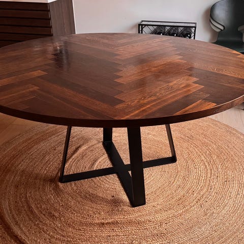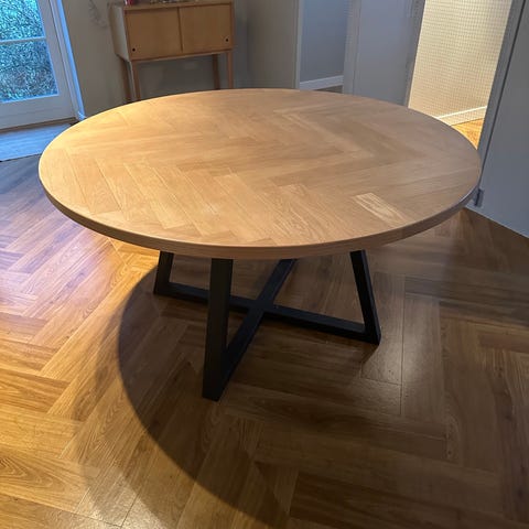 Rundt sildebensbord - Pure - lamelfod - 130 cm, Ingen udtræk. 2 år gammelt. Slebet og behandlet professionelt for 12 mdr. siden (1500kr). Nypris: 13.500kr