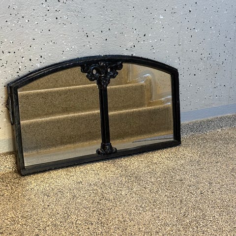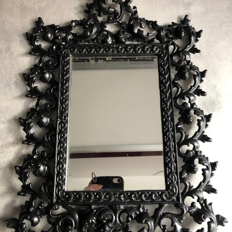 Vintage væg spejl i smedejern med sort finish. Spejlet har et dekorativt design med krøllede detaljer, som tilføjer et elegant touch til ethvert rum. Perfekt til brug i entréen, stuen eller soveværelset.
