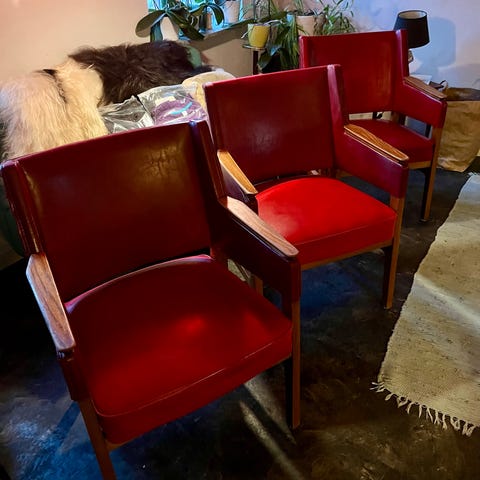 Gamle stole som har været på et skib. Er ombetrukket med rødt stof. Sælges samlet, prisen er for begge stole