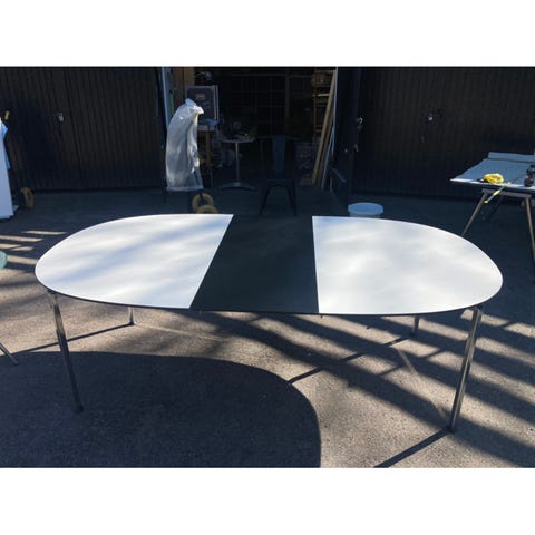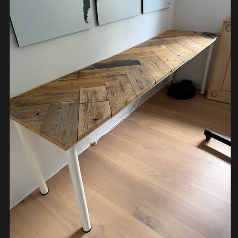 Som spisebord eller kontorbord. Den har desværre fået en hak og lidt farve slitage som kan selvfølgelig fikses🙂