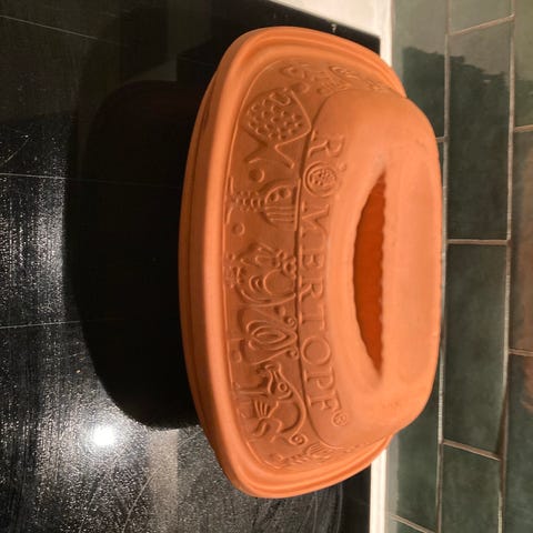 Römertopf, som er en stegeso lavet af terracotta. Denne kvalitets stegeso koster normalt fra ny 399-549 kr jf. Google AI og er yderst velholdt og kun brugt få gange.