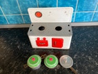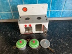 Super fint retro legekøkken / komfur med gryder/psnder til dukker / barbier. Er i metal. Bagpladen kan tages af.
