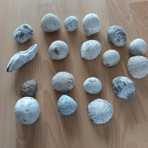 Der er vulkansten, lavasten, koralforsteninger, forstenet træ, pyrit/nattehuld, granit, mandelsten, kalkkonkretion “krabbebolle”, kvartsklynge, fossil og en del andre som jeg ikke kender eller er usikker på hvad er. Giv et bud!