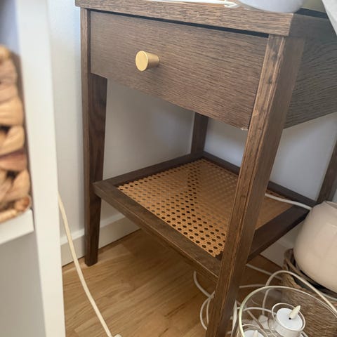 Der er hul i bagsiden så man kan indføre en stik kontakt og have sine devices til at oplade i skuffen samt føre ledning til evt. natlampe ind til stikdåsen som kan gemmes i den øverste skuffe.