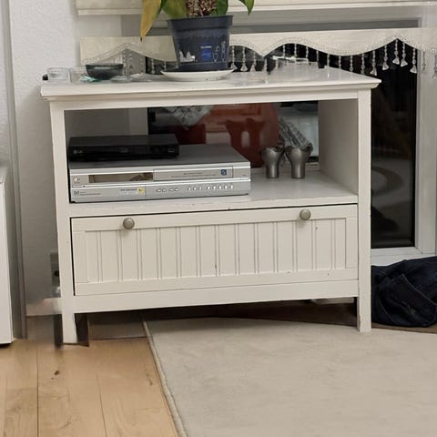 - Materiale: Hvid overflade, stabile ben. Velegnet til opbevaring i stuen, entreen eller spiseområdet.