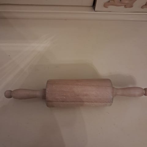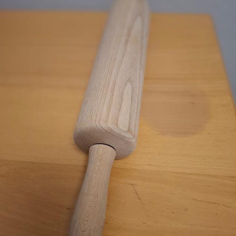 Træ kagerulle med grønne håndtag. Ideel til bagning og udrulning af dej. Lavet af holdbart træmateriale med en længde, der passer til de fleste køkkenbehov.