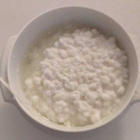 1 stor spiseske mælkekefir, som er aktiv og kan bruges til at lave kefir direkte.