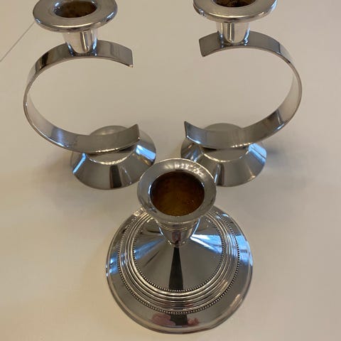 Ukendt sølvlysestager sæt bestående af 2 stykker. Lysestagerne er fremstillet i sølvfarvet materiale og har en klassisk og elegant stil. Velegnet til dekoration i hjemmet eller som en del af en borddækning. Højde 30 OBS FAST PRIS, SENDES IKKE