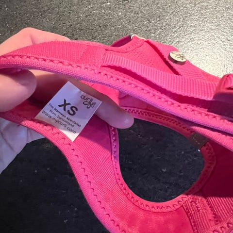 Medium brystmål 43,3- 49, 1 cm. Pink og hvid tern, 2 reflexer. Dogfinder tagen er ikke brugt.