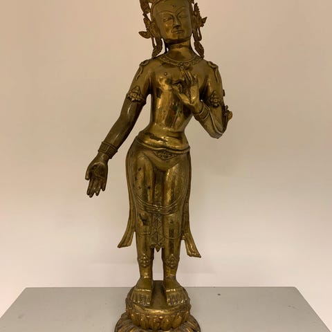 Figur forestillende orientalsk mand på tæppe i formessinget tin og dekoreret