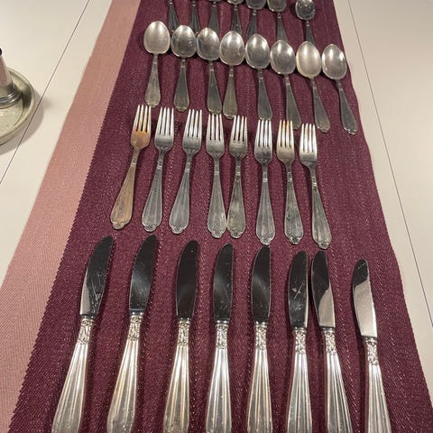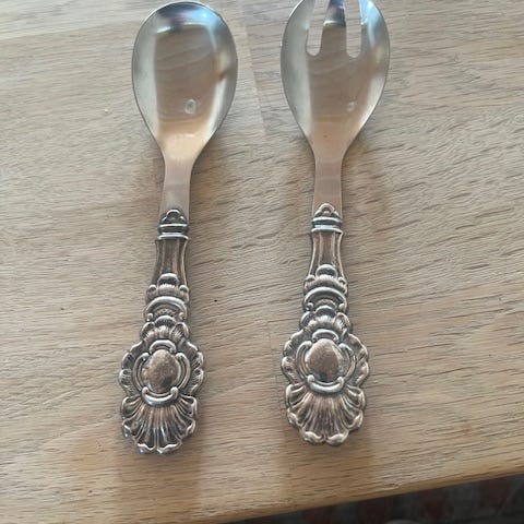 Serveringsdel - salatbestik, hvor skafterne er 3 tårnet sølv og resten i stål.