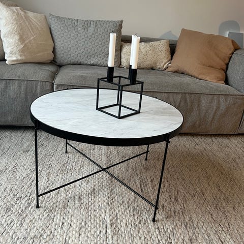Pænt sofabord med træplade med “sten-look”. Pladen kan pilles af så den er nemmere at rengøre og kan evt. vendes. Med metalben.