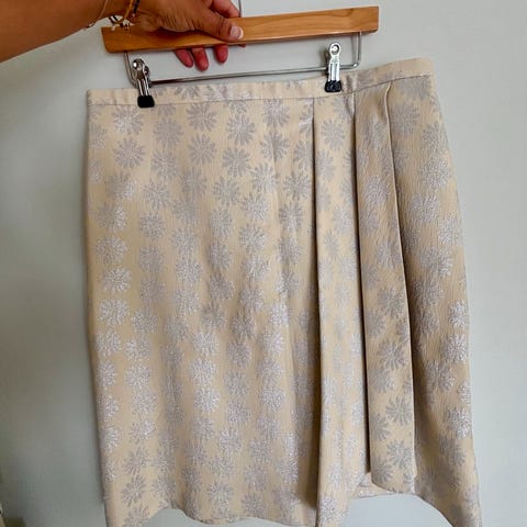 Figursyet nederdel, str. 40, Rützou, Cremefarvet/grå, Bomuld , Næsten som ny, En meget smuk, enkel og velsiddende nederdel med mange fine detaljer. Paspolerede lommer foran, 24 cm lang slids bagpå. En meget flot beskæring bagpå til at fremhæve en smuk bagdel. Se billedet (nr 3)med pude under.