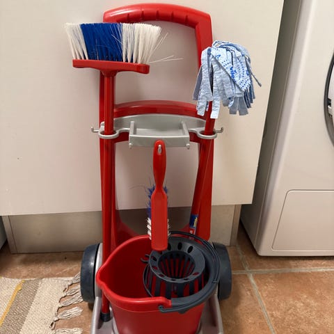 Andet legetøj, Rengøringsvogn børn med redskaber, Vileda, Rengøringsvogn gør rengøringen til en leg, børn kan forholde sig til. Toiletgulvet og badet har godt nok fået nogle omgange efterhånden lol. Det var et hit til legeaftaler. Nu må den må glæde andre. Børsterne er selvfølgelig brugte men kan sagtens bruges videre. Jeg ved at man også godt kan købe nye hoveder, som nogle har gjort i min omgangskreds.