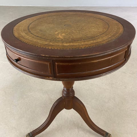 Smukt rundt sidebord med lædertop og kløfødder.