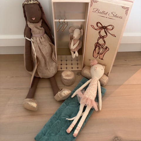 Der er i alt 8 dukker – 4 af dem står i deres kasser, og 4 står ved siden af. Alle dukkerne er i god stand, bortset fra soveposen på den lille baby-mus, som har nogle små, spøjse pletter på bagsiden af soveposen.