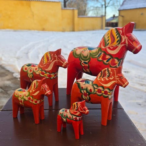 fra tyske Gecevo kommer her en trækhest med høstvogn. den er fremstillet i bøg og er fra omkring 50'erne. Den mangler sine vognstænger. Men er særdeles velegnet som en forårsbebuder til påskeæg eller senere på året med juleknas.