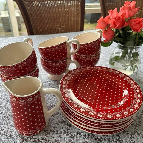 Romantisk kaffe / chokoladestel med kaffekande, chokoladekande, fløde og sukker sæt og 5 kopper og kagetallerkner