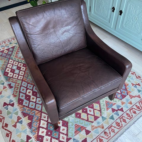 Stand: God, men med naturlige brugsspor (patina i læderet og lette folder i hynderne)
