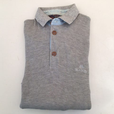Velholdt SAND polo bluse / t-shirt okkerfarvet med koksgrå krave. Kun brugt lidt, da den er købt for lille.