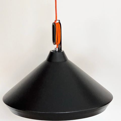 Lampen har et enkelt design med rene linjer og et ophæng, hvor man kan vikle kablet rundt for nemt at justere højden.