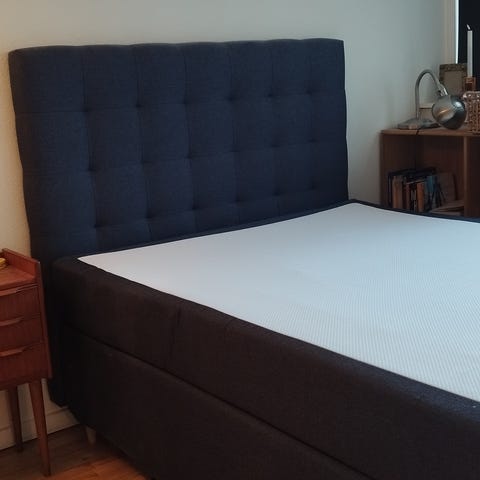 Fast fasthed med topmadras i fuld størrelse (200x200 cm).