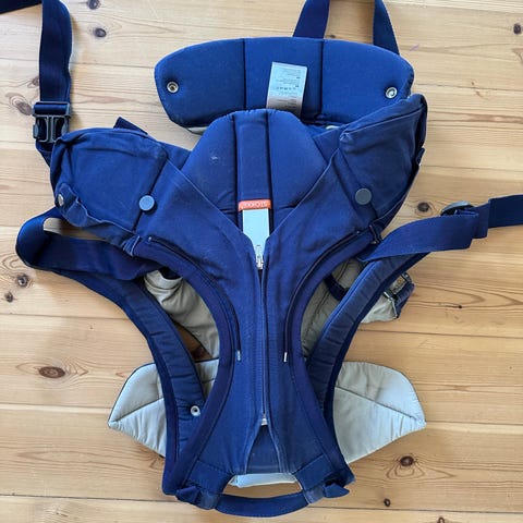 Stokke bæresele i en neutral farve. Selen er designet til at give komfort og støtte til både forælder og barn. Den har justerbare stropper og spænder for at sikre en god pasform. Selen har Stokke logoet broderet på forsiden.
