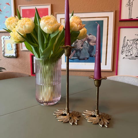 Lysestager. Et par antikke smukke messing-lysestager. Persisk oprindelse. Må være 100 til 200 år gamle. Højde 158cm. Bredde fod 24cm. Kan skilles ad i mindre dele med messinggevind ved hver skål.