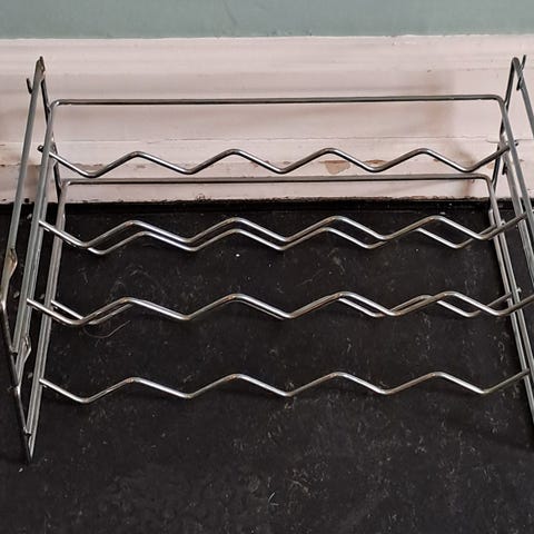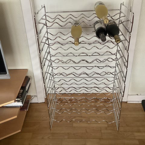 Grå metal, stabelbar med glasplade øverst. Plads til 30 flasker. Sælges kun samlet