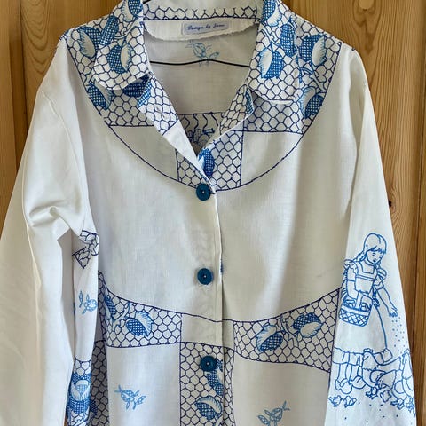 Meget smuk jakke i vårgrøn med hvide broderier syet af broderede duge i eget design, Design by Jane, str M-XL med knapper og lomme sælges kr 950,-, fragten aftales individuelt!