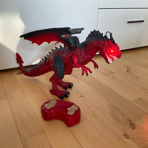 2 fjernstyrede drager, der kan lave damp, lyde og gå. Sælges samlet for 200kr.
