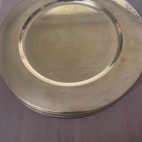 Dæktallerkner i Messing. 4 stk. som vejer 1,580 kg og Ø 28, Velegnet til dekorative formål eller servering. Sættet indeholder fire tallerkener, der kan bruges til at tilføje et elegant touch til borddækningen, Er fra 70/80erne.