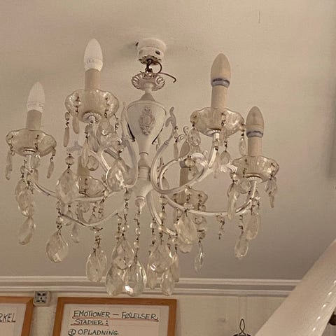 Lysekrone til strøm. Er defekt hist og her, men ses ikke, når den hænger. Perfekt til sommerfesten i teltet. Vejer 15 kg.