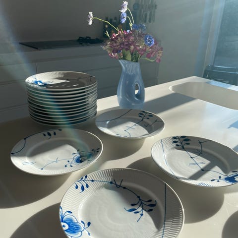 4 kage tallerken og 4 krus (2 Krus m lille hak) samlet 2000. Solgt 4 tallerkener