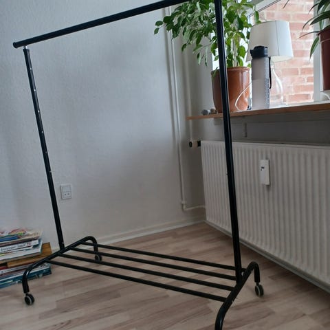 9 stk. Skrå frontophængt bøjlestang i robust blankt metal med plads til 8 bøjler - man kan sagtens hænge dobbelt op med bøjler - 2 pr. knop uden problemer.